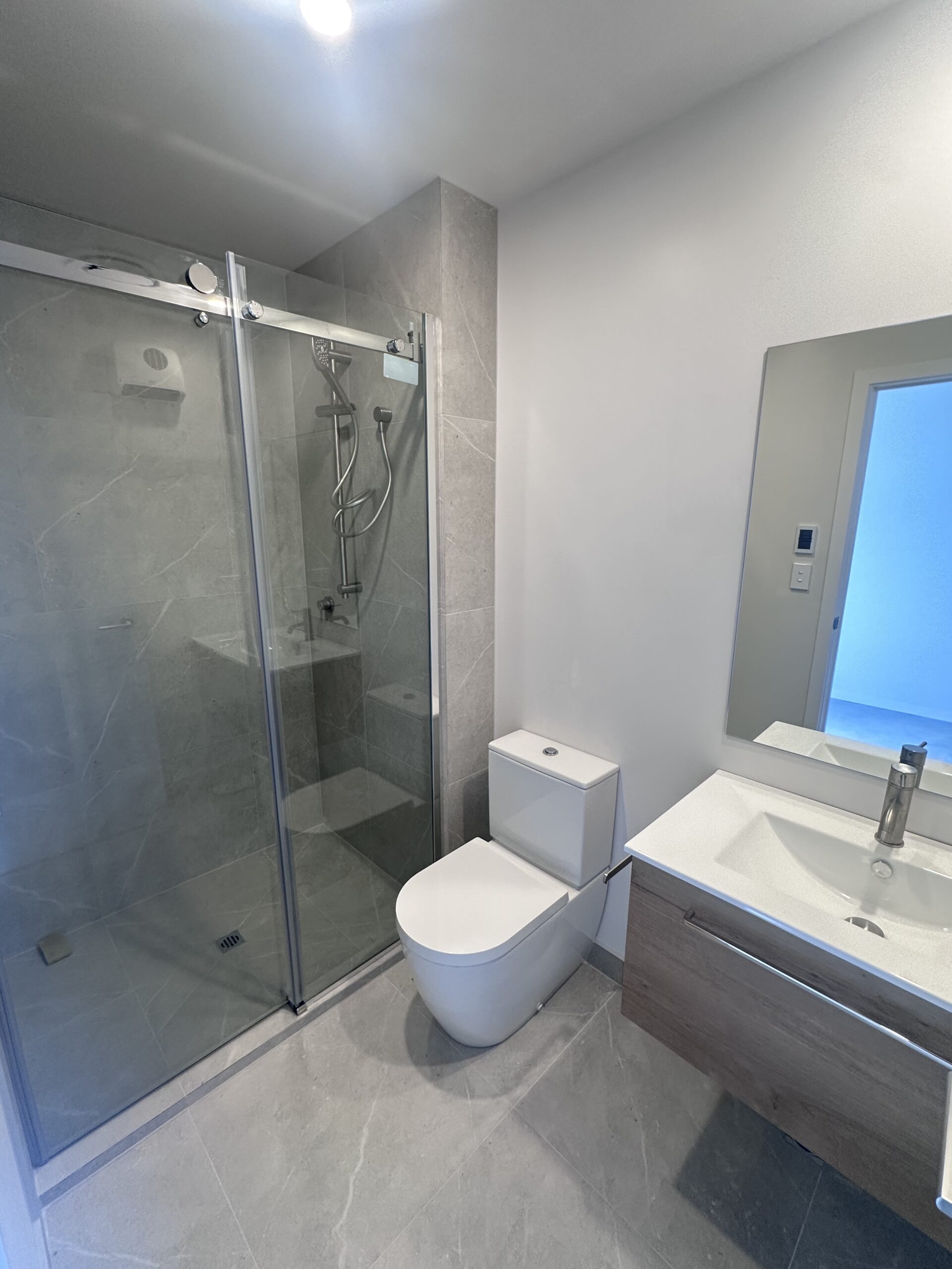 - Modern fit-out: Kitchenette with dark cabinetry and stone benchtop, plus a full bathroom with shower, vanity, and toilet.
